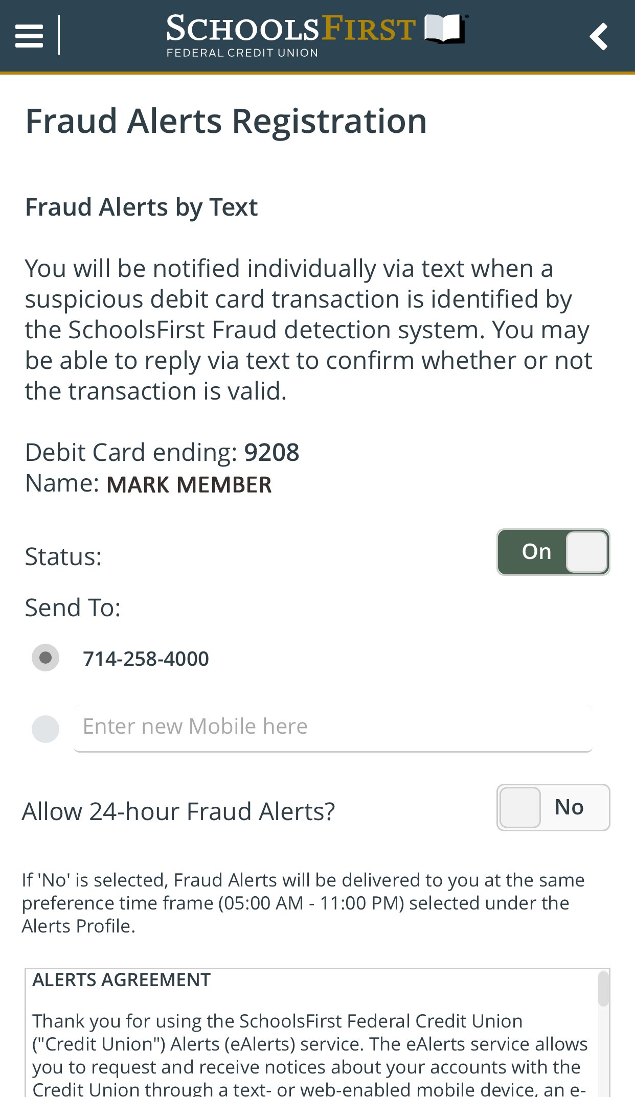 Schoolsfirst Fcu On Twitter Techtiptuesday Set Up Text Message Fraud Alerts Through Mobile Banking Log In Gt Main Menu Gt My Profile Gt Fraud Alerts Registration Https T Co Fa8qr9gomx Twitter